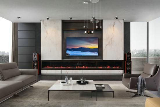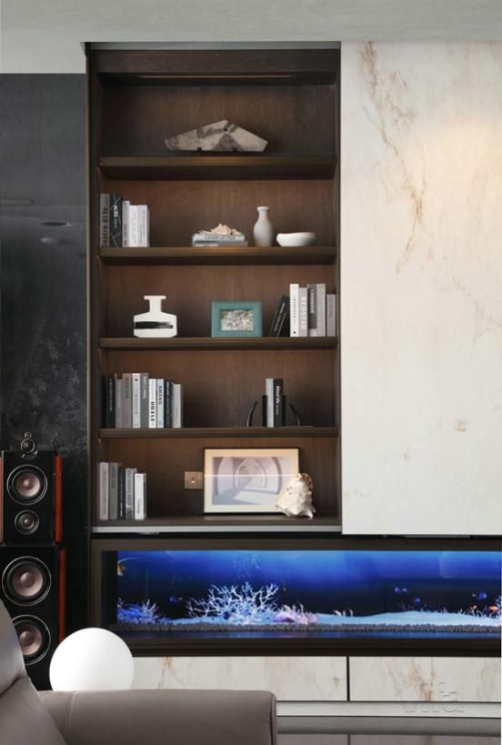 这里不得不再夸一夸高端定制的视听柜,采用电子成像技术作为装饰壁炉,呈现出立体、逼真的视觉效果,冬天可以做出带火焰的壁炉效果,夏天则可以切换成鱼缸效果,让空间里多了一些动态感的元素,充满活力。专为别墅打造的高科技炫酷客厅柜,是不是被这巧妙的设计惊喜到了!