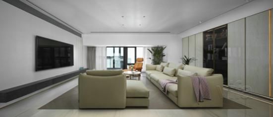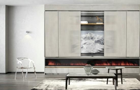 柜门开合轨迹为“错位+滑动”,看完电视,一键关上柜门,所有门在同一平面,电视机采用壁挂式方式隐藏其中,显得干净利落,焕然一体,整齐美观。