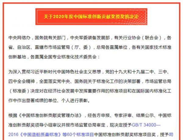 据悉,按照《中国标准创新贡献奖管理办法》(市场监管总局公告2020年第15号)和《市场监管总局关于开展2020年中国标准创新贡献奖评选活动的通知》(国市监标创函〔2020〕232号),中国标准创新贡献奖评审委员会对通过初评的候选标准项目奖、组织奖和个人奖进行了严格评审,形成了各奖项评审委员会建议名单,并于9月7日至9月11日在国家市场监督管理总局官网上进行了网络公示。经公示和严格审定,国家市场监督管理总局、国家标准化管理委员会最终决定授予GB/T 34000—2016《中国造船质量标准》等60个标准项目为中国标准创新贡献奖。