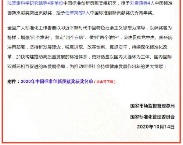 ▲国家市场监督管理总局、国家标准化管理委员会发布的《关于2020年度中国标准创新贡献奖授奖的决定》。