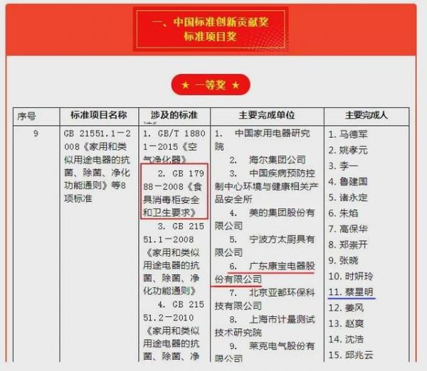 ▲康宝主导起草制定的GB 17988—2008《食具消毒柜安全和卫生要求》等标准荣获国家标准创新贡献奖一等奖!