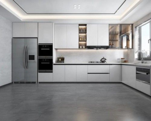 低饱和度的白色橱柜与地面铺贴的灰色色系月光岩AC12625RG 在颜色上正好相互搭配,毫无违和地融合一体,整体感觉高贵而轻奢!黑色的吊顶装饰和黑色的橱柜配件上下呼应,增加空间的层次感。