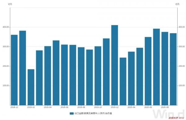 图/近一年多来我国家具及其零件出口金额(单位:亿元)