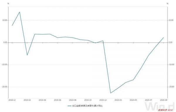 图/近一年多来我国家具及其零件出口金额同比情况(%)
