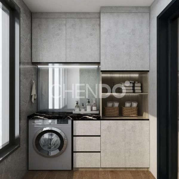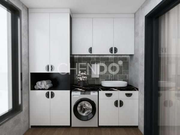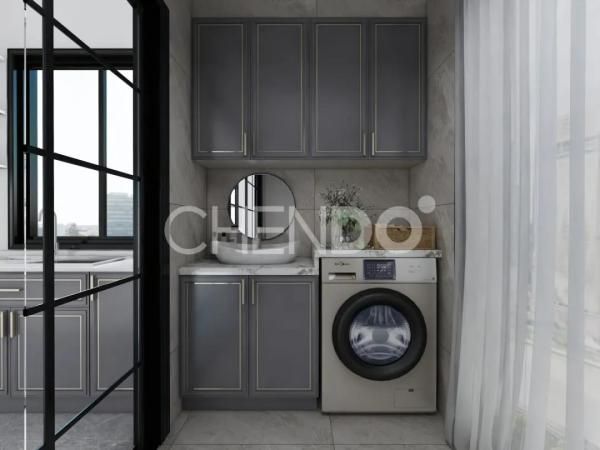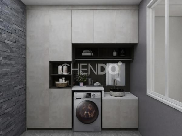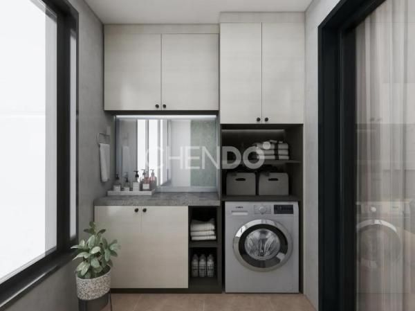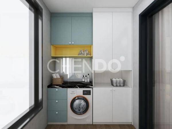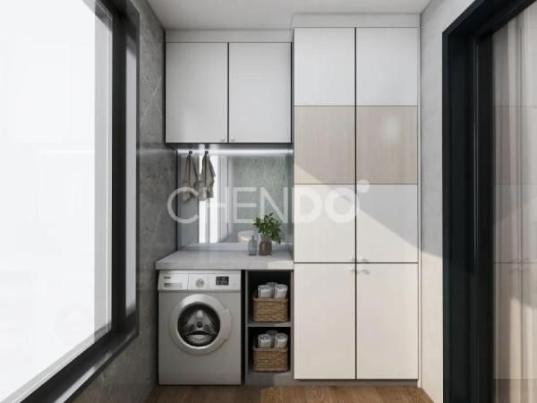 一字型阳台柜,两侧都是墙体,可以安装置顶柜,收纳更多物品。