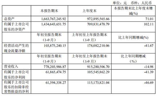 截至本报告期末,公司总资产为16.64亿元,同比增长71.01%;归属上市公司股东的净资产约14.35亿元,同比增长102.11%。
