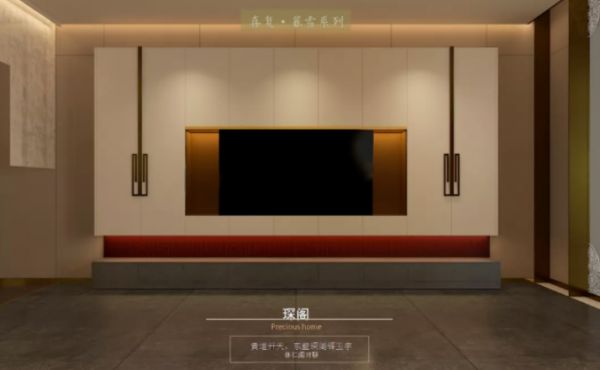 “琛阁”电视柜体外观大面积选用茶白色,柜体把手以故宫黄云纹装饰,柜体内部以经典故宫红装饰,寓意“开门见喜”,整个客厅空间风格和谐统一,演绎人间至美故宫雪景。