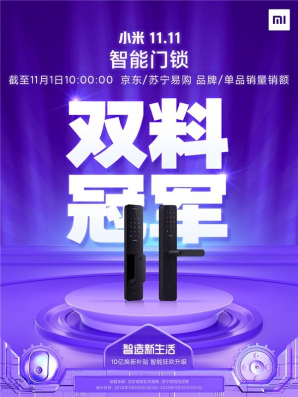 10月21日,2020年双11预售正式“开战”,小米携智能门锁系列掀起预订风暴。11月1日预售开始付尾款,仅30分钟小米智能门锁就销售30000台,10小时销售量达66000台。在京东/苏宁易购渠道 品牌和单品销售额双料冠军,原价1699元的小米智能门锁推拉款到手价1449元,成为同类产品中的爆款产品。