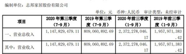 [三季报]志邦家居第三季度总营收11.5亿