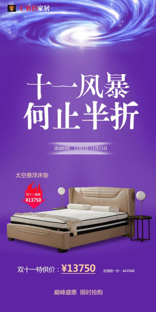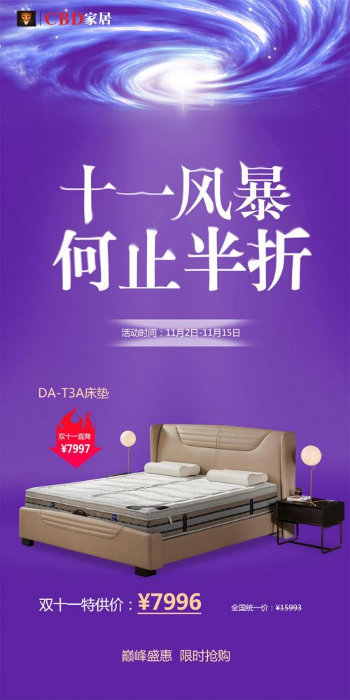而在本次双十一特惠活动里,CBD家居更是携DA-T3A床垫、太空悬浮床垫和女神3号床垫等多款高颜值家居产品,以不止半价的折扣力度牢牢锁住消费者的注意力。
