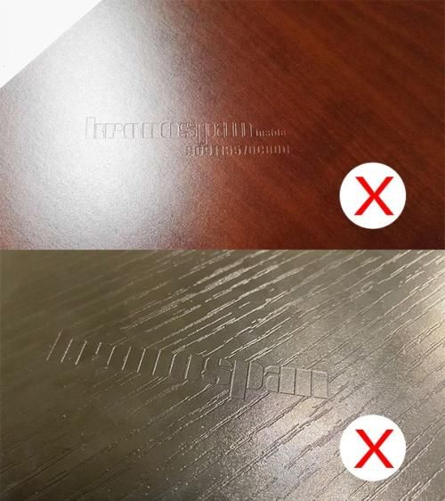 其次看饰面,真的克诺斯邦板材的饰面是很耐看且不易模仿肉眼就能看出来,以K开头的是克诺斯邦的专利花色。这里教大家看一个克诺斯邦的0101型号,这是克诺斯邦的基础麻面白色,因为是基础色都可以模仿出来所以他有钢印,且钢印与克诺斯邦的logo一致一实心一镂空,斜排均匀分布且每个logo长5cm。其他型号没有logo。