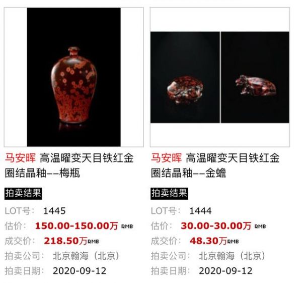 2020年9月12日,北京翰海拍卖有限公司成功拍卖马安晖两件作品,其中高温"曜变天目”铁红金圈结晶釉梅瓶以218.5万元成交,高温"曜变天目“铁红金圈结晶釉金蟾以48.3万元成交。