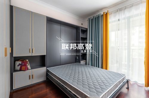 主卧采用高级独特暗纹的雪花印门板,触感细腻有光泽。门缝间的一体式金沙拉手,极具纤细感。联邦高登全屋定制以L型转角到顶衣柜的设计,将叠放区、挂衣区、化妆区、衣帽间全都容纳其中,营造出一个功能齐全且浪漫温馨的卧室。