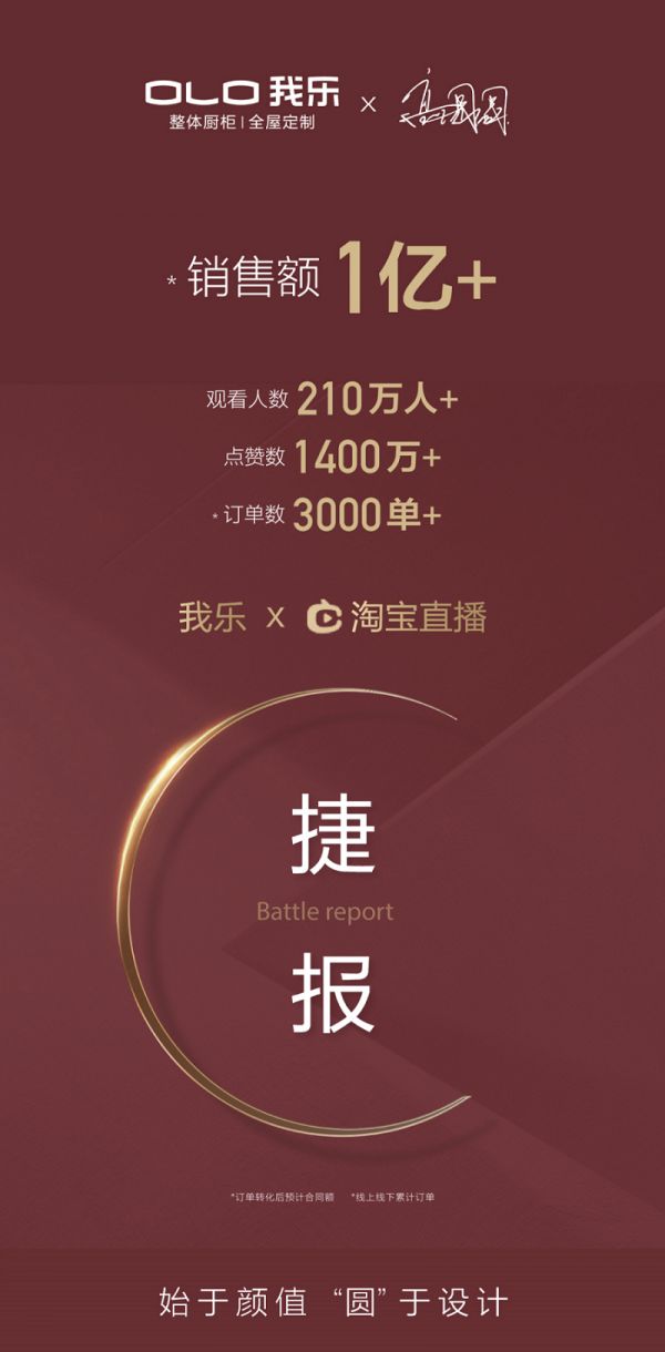 据悉,10月31日,在这场主题为“我乐颜值设计之旅”的直播活动中,我乐家居和旗下代言人、知名女星高圆圆,共同呈现了一场长达12个小时的直播大秀,再创淘宝直播新纪录,摘得家装行业活力装修榜冠军头衔,并在单小时区间以及整场12小时时段内,皆夺得家装行业直播间点赞数、总观看人次、平均观看时长、直播间浏览次数、成交单数、成交金额6项第一名,狂揽近210万人+在线观看,直播锁定销售额1亿元+,为“双十一”电商节的全屋定制品类拉开了完美的序幕。