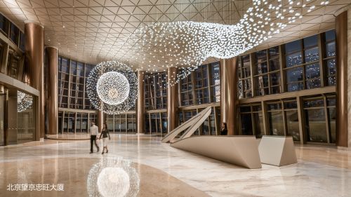 北京望京忠旺集团公共空间项目,Gensler设计团队通过巧妙的设计手法,用一条与建筑语汇吻合的柔和曲线将空间中遗留的单柱与空间融为一体,将空间转化为生动的流线型。大厅中的艺术吊灯,在夜幕来临的时侯,仿佛璀璨星光。另外在大堂中的核心筒墙体的材质是由客户自己的铝品研发基地生产,充分展现了忠旺集团的铝质产品制造能力。Gensler和客户共同创造了一个尽显公司愿景与文化的高品质融合体验空间。