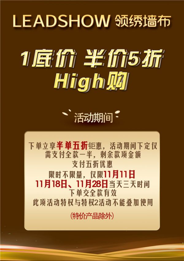 下单立享半单五折钜惠,活动期间下定仅需支付全款一半,剩余款项金额支付五折优惠。