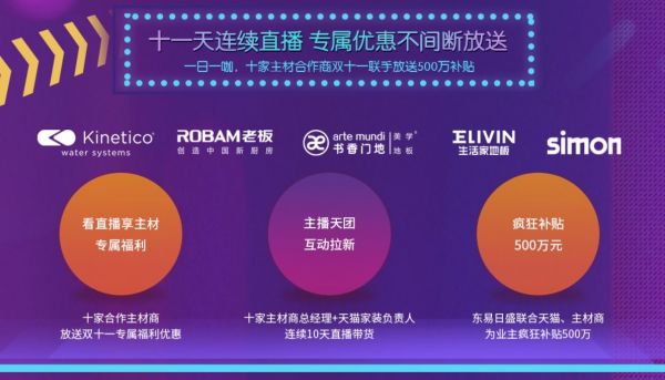 以家装老牌企业东易日盛为例,在今年疫情来袭的大背景下,东易日盛积极拓展线上渠道,通过多场成功的线上直播、返利活动与客户在疫情期间保持沟通,同时通过大力度的优惠福利回馈业主,让许多家庭圆了自己的装修梦。随着双十一的来到,东易日盛也开始筹备新一轮的直播优惠活动。在11月1至11日的这11天里,东易日盛将联合7大品牌商为消费者呈上11场直播活动。从地板到烟机灶具,从定制木作到净水系统,从集成吊顶到电气开关,受邀参加联合直播的这 7大品牌均是各自行业中的龙头品牌,其产品、服务等方面在市场上中均有着良好的口碑与认可度。此次东易日盛的双十一直播活动惊喜不减精彩依旧,除了为客户们带来高品质的装修服务及主材特惠外,11月11日当天更是为想装修的客户们准备了五百万元巨额补贴。