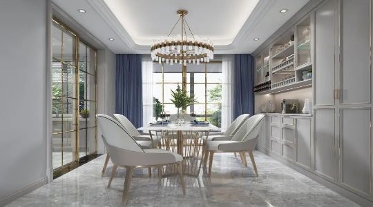 其次,客厅采用极简背景墙+全功能电视柜,创造精致活力空间。沙发背景采用实木包覆线条镶嵌金色铜条工艺,一抹金色增添了整个客厅的视觉冲击力,化繁为简抛弃古典欧式的繁冗。整体空间以灰色做为背景色,蓝、金色作为点缀,高雅灰与金色搭配独具审美与品味。