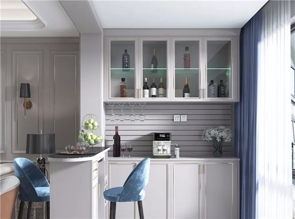 客厅与阳台之间采用开放式设计,打造精致休闲阳台,吧台酒插格、封闭柜门相结合,增加储酒空间,同时方便拿取,封闭柜门,放置需隐蔽物品。玻璃柜门+玻璃层板,增加柜子通透性,展示酒具、装饰品和藏酒,下方空间可以灵活收纳物品,设有插座,满足用电需求。