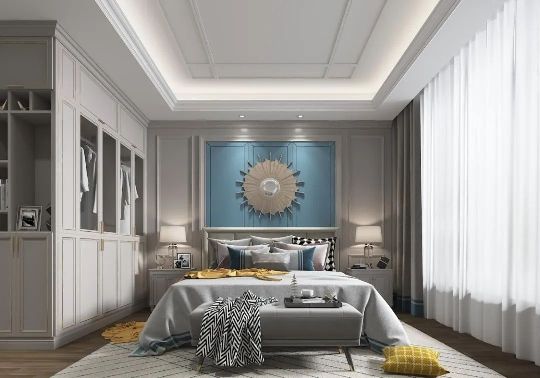 值得一提的是,千年舟·全屋易装推出的《艾菲尔Ⅱ系列》,主卧多组合分区设计,床尾采用衣柜、电视柜、梳妆柜组合搭配,营造出休憩空间的舒适氛围。床侧边的柜体可用于收纳应季穿着衣物,高雅灰贯穿场景主线,黄、蓝色彩作为点缀,提亮丰富空间色彩。上柜采用上翻门设计,中间采用玻璃柜门增加空间通透性,悬挂日常穿着衣物。实木包覆线条组合实木护墙,简约大气,也增强了卧室的文艺范。