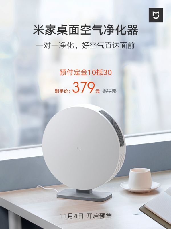 11月4日,首款米家桌面空气净化器正式在小米商城开启预售,到手价仅379元。11月11日当天全渠道正式开售,全渠道开售。同时这款产品的滤芯也将在11月11日开售,售价79元。