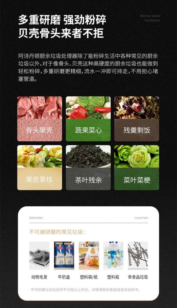 骨头、鱼头、鱼刺、蛋壳、玉米棒芯、菜叶、果壳、果皮、咖啡渣、茶叶渣、残羹剩饭等厨余垃圾可以轻松处理,有了阿诗丹顿厨余垃圾处理器,从此再不用担心水槽堵塞,也不用手动处理湿漉漉的厨余垃圾了。