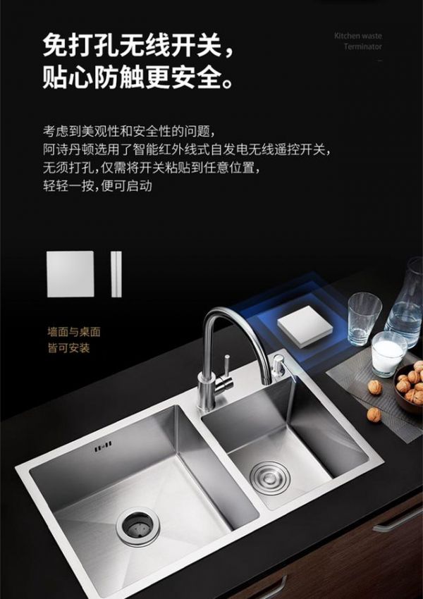 阿诗丹顿厨房垃圾处理器最大的优势在于其使用简单便捷,机器安装完成后,操作按键仅一个,使用步骤也只四步,将厨余垃圾倒入水槽下水口,打开水龙头,打开垃圾处理器的开关,关闭。一键轻松改善厨房的卫生环境,让家庭厨房保持清洁健康。