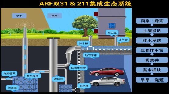 ARF地下智防水系统应用在建筑顶板,是以ARF双31一体化防排系统为主,其特点是三层防水、三层阻根、一层排水、一层集水,具备系统优势、造价优势、工期优势、施工优势等多种优势。主动与被动防水结合,使防水效果更长久,是防排结合的原理在应用技术中的充分体现。应用在建筑侧墙,是以ARF211地下侧墙一体化防排系统为主,其特点是两层防水、一层排水、一层防护,可以快速有效的导出雨水,减少甚至消除土壤中孔隙水的静水压,具有优异的防水、防护性能,兼具隔音及通风防潮功能,寿命期内综合效果显著。