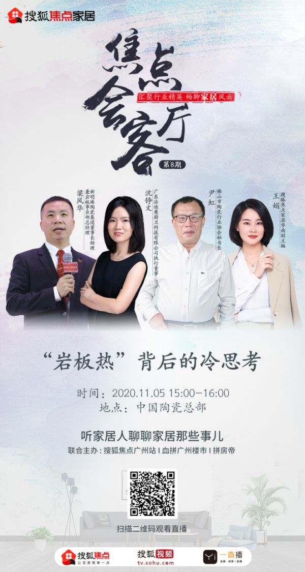 汇聚行业精英,畅聊家居风云!本期《焦点会客厅-家居》特别邀请到新明珠陶瓷集团董事长助理兼岩板事业部总经理梁风华、广东法迪奥厨卫科技有限公司执行董事沈铮文、佛山市陶瓷行业协会秘书长尹虹,三位嘉宾将聚焦“岩板热”,共同探讨“岩板热”背后的危与机。11月5日15:00-16:00,搜狐焦点家居《焦点会客厅》广州站线下沙龙,诚邀您的参与!