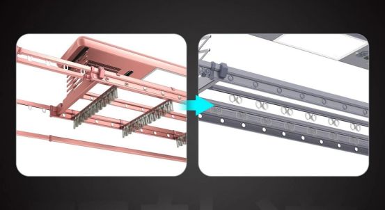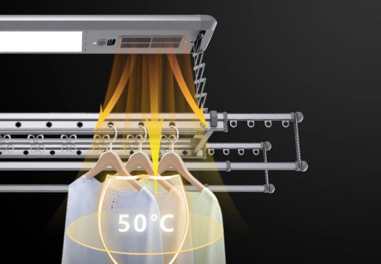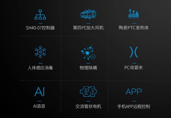 搭载了超静音斜齿交流管状电机、SH40-07控制器、第四代加大风机、高功率陶瓷PTC发热体、语音控制芯片、医用紫外灯、超声波除螨仪、人体感应模块等新升级的元器件,集成了AI语音声控、杀菌、除螨、风干、烘干、人体感应、照明、智能升降等专门针对晾衣开发的功能。