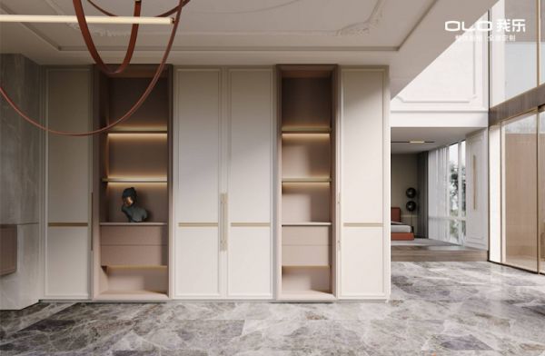 全屋定制新品罗莎·罗曼系列贯彻了罗莎系列的法式色彩美学,对产品色彩和工艺进行了大幅度升级,以温婉的设计语言描绘浪漫生活场景。最为亮点的是2.7米高大肤感铝框门,更高的一体化门板让空间更显开阔高级。古典罗马柱造型拉手、精巧比例腰线设计、多门型搭配组合,以精致细节的融入,让家成为容纳更多想象的美好生活殿堂。