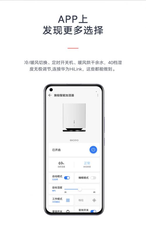 荣耀施铂加湿器通过触控屏可以设置冷暖风的不同状态,这样的智能化设计,无论是什么环境,它都能根据实际设置调节冷暖风,让你回家的时候就能感觉到最舒适湿度,这也使得荣耀施铂加湿器看上去更像是一个机器人,满满的科技感彰显出用户一家对于高品质生活的追求。