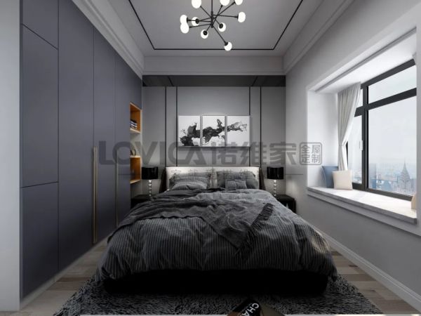 主卧用黑白两个色调,体现出低调稳重,地毯、衣柜以及墙上的装饰艺术品,让空间连贯一致,营造出舒适、温馨、自然的睡眠环境。