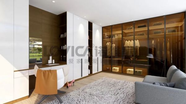 衣帽间运用明亮、收纳、功能齐全的特点,让整个空间体现出实用性强,又不失奢华。透明衣柜更方便衣物寻找,到顶收纳柜储物加强,加上梳妆台设置更是贴心。