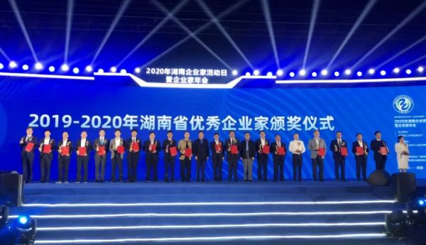 2020年11月5日上午,由湖南省工业和信息化厅、湖南省企业和工业经济联合会主办的“2020年湖南企业家活动日暨企业家年会”在长沙圣爵菲斯大酒店隆重举行,副省长陈飞,省政协原副主席、省企工联名誉会长武吉海,省国资委副主任张翔,省企业和工业经济联合会会长杨月华,省工信厅厅长黄慧泉等领导等省直相关部门领导、专家委员会、各会员单位负责人等500名代表参加会议。会议表彰了20名2019~2020年湖南省优秀企业家。副省长陈飞,省政协原副主席、省企工联名誉会长武吉海为获奖者颁奖。