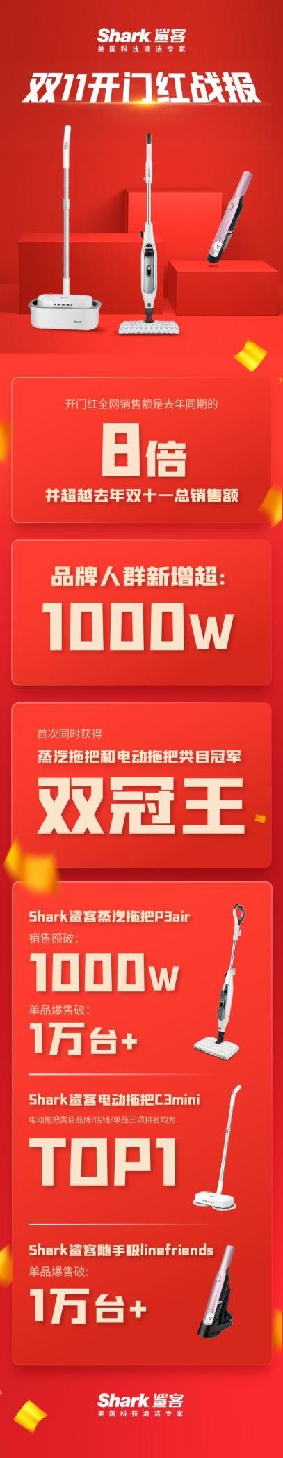 Shark鲨客喜获天猫双11开门“红”:登顶蒸汽拖把与电动拖把双类目榜首