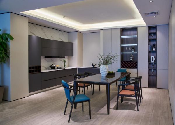 色彩搭配——冬季建议以明快色调为主,用餐时能感觉到和煦的温暖,同时还能够增强食欲。但如果整体风格比较沉稳,就可以从桌椅、摆饰等物件入手进行装饰点缀。