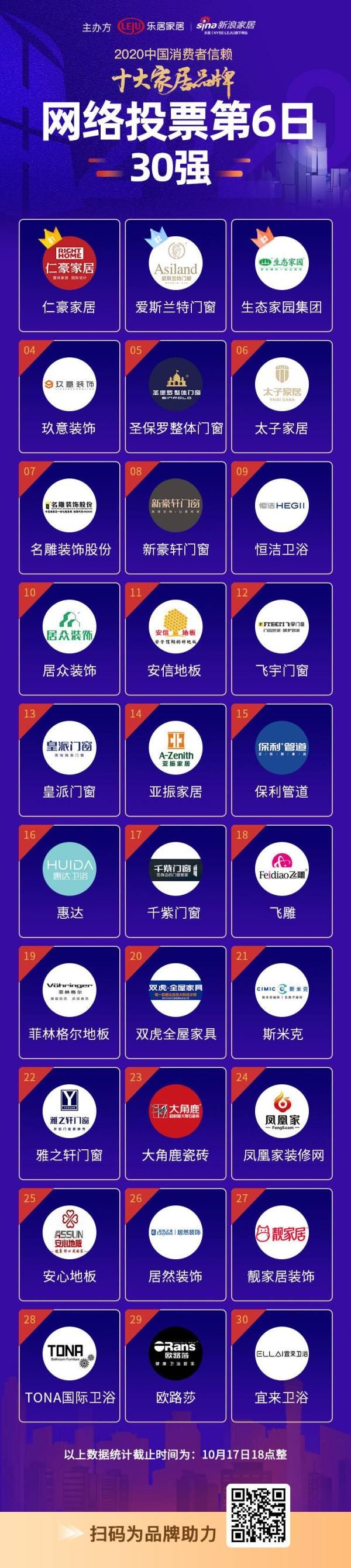 网络票选阶段目前仅剩最后两天,已进入冲刺阶段,竞争日趋激烈,前30强座位变化频频,前10名更是一日多变。目前,仁豪家居依然排名第一位;爱斯兰特门窗强势冲刺来到第二名;生态家园集团冲刺到新高的第三名。第四至第十位分别是:玖意装饰、圣堡罗整体门窗、太子家居、名雕装饰股份、新豪轩门窗、恒洁卫浴、居众装饰。投标到第六天,与第一天TOP10相比,已有六个座次发生变化,投票即将尘埃落定,最终哪些品牌将入围「2020中国消费者信赖十大家居品牌」?>>>点击为候选品牌投票