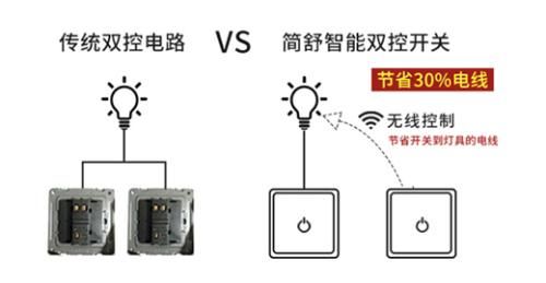 其实安装了简舒智能开关还有我们意想不到的一些功能哦,解决了很多传统开关的弊端,以灯光的双控为例来给大家阐述一下,传统的双控开关常见用于房间的照明和楼梯间的照明,比如房间进门处安装一个开关,床头再安装一个双控开关,这2处的开关都会走线到同一个灯具,这样其实造成了线路的极大浪费,而用简舒的智能开关就能很好的解决这一浪费,为我们节约不少的电线还能达到同样的效果,甚至是更好用更方便。使用简舒的智能家居系统后,就只需要在进门处安装一个智能开关,而床头就只要安装一个无线的随意贴,这样无线的随意贴就不用与灯具之间走线路,这一部分的线路就完全省掉了,另外随意贴的安装更随意,可以贴在墙上,也可以贴在床头柜上,安装了智能开关后还可以直接不用下床,就用手机APP控制开灯和关灯,是不是比传统的双控开关更省钱更省事还更方便?