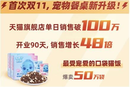 在今年7月30日,中国销售规模最大的食品电商企业三只松鼠也正式推出旗下首个宠粮品牌“养了个毛孩”,上线仅20天,三只松鼠的这位毛孩强势入围天猫2020新锐品牌计划,上线一个月,月销售额就已经突破了两百万元,超过普通同行2年的业绩,天猫DSR三项平均皆高于行业50%。在今年的首个双十一,养了个毛孩也拿出了十分耀眼的战绩,其中养了个毛孩天猫旗舰店单日销售破100万元,开业90天,销售增长达到48倍,其中广受主子们宠爱的口袋猫饭爆卖50万袋,而猫咪冻干组合更是在开卖15秒就一抢而空。