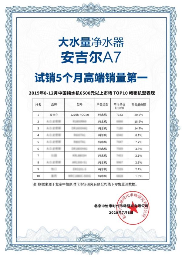 根据第三方市场调研机构中怡康公布的家电销售数据显示,高端净水专家安吉尔推出的A7 lite大水量净水器试销五个月连续登顶净水器品类销量排行榜,凭借出色的品牌力与产品力,一骑绝尘领跑全国净水市场。