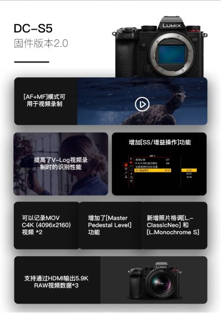 够专业: V2.0固件为S5增加了5.9k RAW视频外部录制和C4K(4096×2160)内部录制。加上原本就支持的4K 60p内部记录与V-LOG,S5无疑是这个价位上视频记录能力相当全面的全画幅相机。