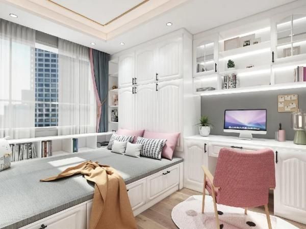 有人会觉得飘窗很鸡肋,但是如果把飘窗柜和衣柜完美地融合在一起,兼具休闲和收纳功能那岂不是很完美!飘窗柜上铺上软垫,储物、看书、娱乐休憩都可以,既能让室内显得清爽舒适,又能满足多功能使用需求。