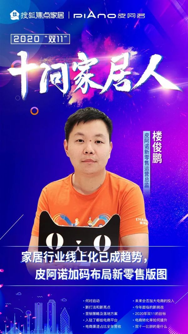 皮阿诺新零售运营总监楼俊鹏在接受搜狐焦点家居专访时,提到了皮阿诺今年双十一的新亮点。双11作为最大的线上促销节点,今年皮阿诺以预售定金蓄客,两阶段0点爆发,双11当天抽免单等钜惠折扣。除此之外,“线上服务+线下体验”模式进一步优化升级。