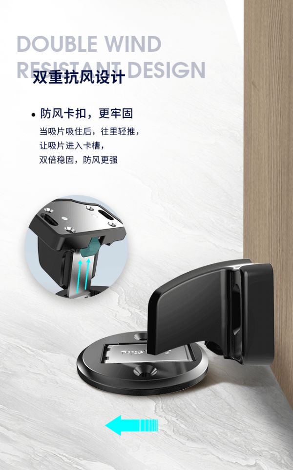 在抗风方面,这款静音防风地门吸和普通地门吸也有不同,采用了双重抗风设计,包括强力磁吸和防风卡扣,可以硬抗强风,无需担心吸不住门。