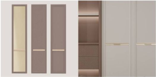 该系列以2.7米高大肤感铝框门为亮点,铝框表面同样覆盖凝脂釉白与淡墨红茶色进口PVC肤感膜。铝材本身良好的稳定性使其耐刮耐划、不易变形。突破传统木材包覆门框1.7米的高度限制,更高的一体化门板让空间更显开阔高级。腰线部分由铝材氧化处理后制成,在视觉上形成精巧分割比例。铝框门内芯板除同花色肤感膜包覆芯板外,更提供深压纹皮格芯板、流光金与冰镜银夹丝玻璃可供选择,实现个性化的全屋定制。