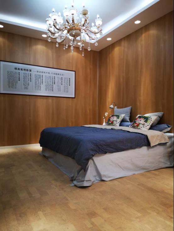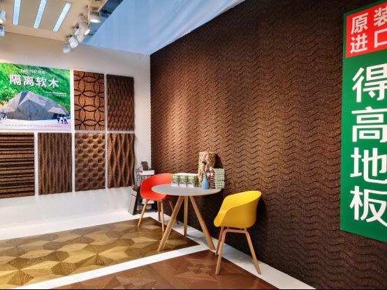 好地板也需要搭配好基材,得高碳化隔离软木在展会上也是大放异彩。软木在家居产品中比较常见,例如软木做的酒塞、杯盖,或者可随意订挂照片的主题墙等。其实软木作为家居材料,可塑性很强,得高在展厅现场展示了旗下多款造型丰富的软木设计。铜钱花纹、点画纹理等都极具装饰性,而波浪线的花纹设计不仅更美观,还能具有增强其吸音和阻止声波反复折射的作用。
