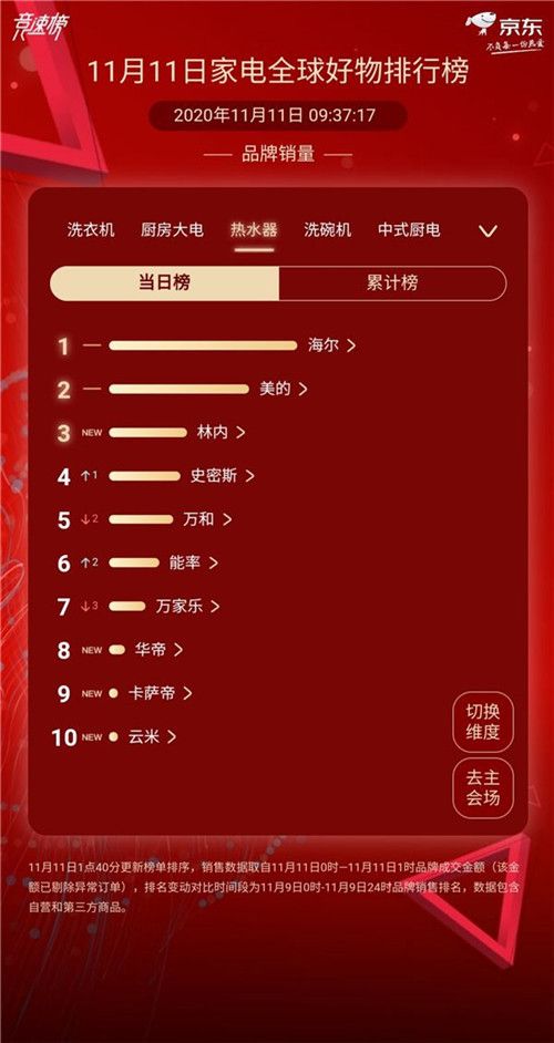 据京东家电全球好物排行榜数据显示,截至11日1点40分,海尔热水器当日品牌销售额居TOP1,累计榜单中,海尔热水器也处于领先位置,成为用户的首选品牌。