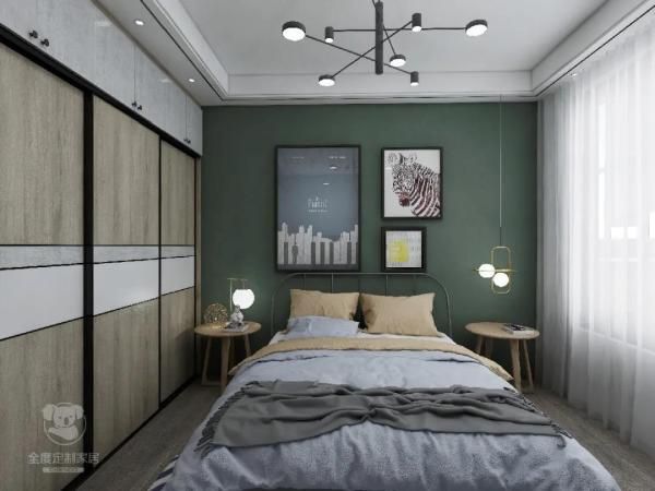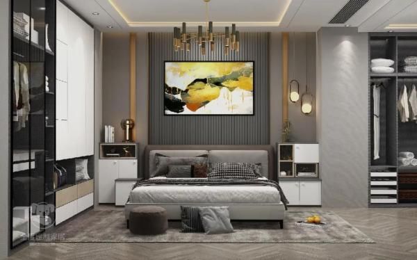 平开门的衣柜要预留足够的空间来开启,太过狭窄的过道,床头柜会与柜门打架。可以尝试将床头部分的柜子做成开放收纳架。