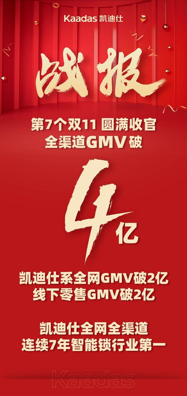双11狂欢大促于昨日圆满收官,据天猫官方数据显示,11.-1-11.11总交易额达4982亿,而智能门锁行业也传来捷报连连,凯迪仕作为智能锁行业霸主,凯迪仕系全网GMV破2亿,线下GMV破2亿,以全渠道GMV破4亿的傲人战绩,连续7年夺下全网全渠道行业第一!